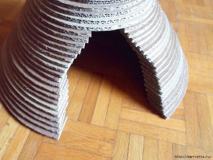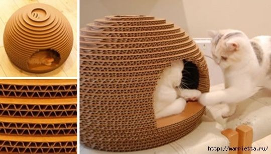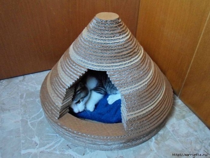 Уютный домик для кошки из картона можно сделать даже из упаковочных коробок.