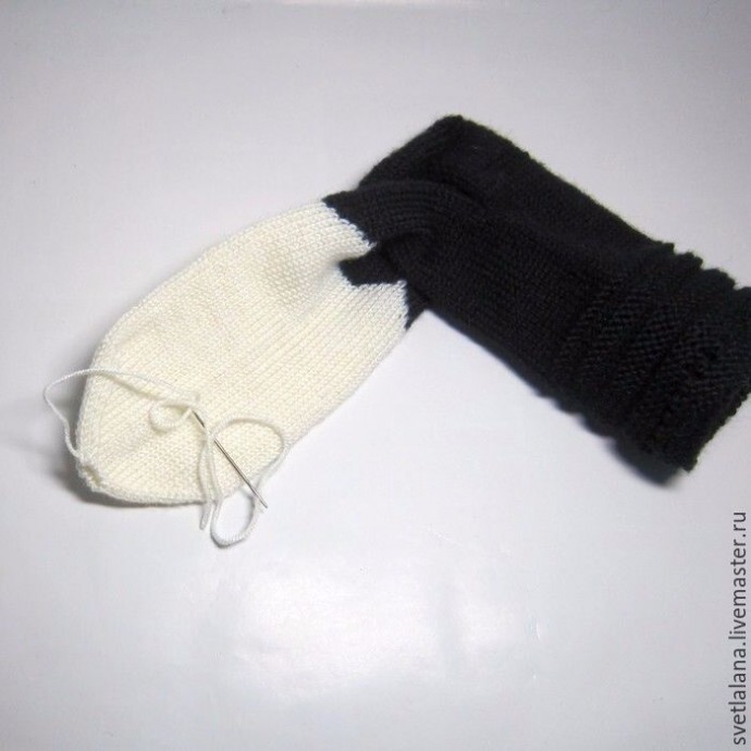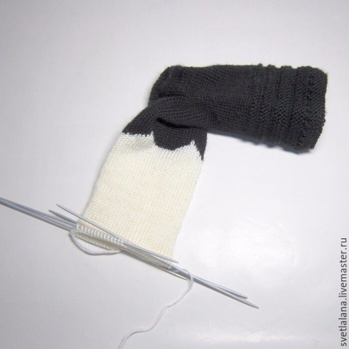 Второй носок вяжем аналогично первому, меняя местами цвета — белым начинаем, черным продолжаем и заканчиваем.