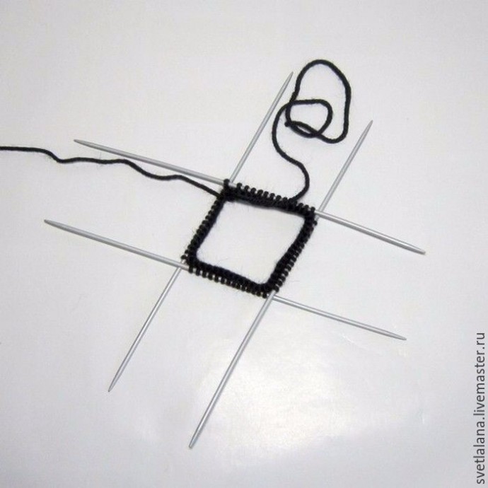 Распределяем петли на 4 спицы, по 14 петель на каждую, начинаем вязать первый ряд лицевыми и соединяем вязание в кольцо.