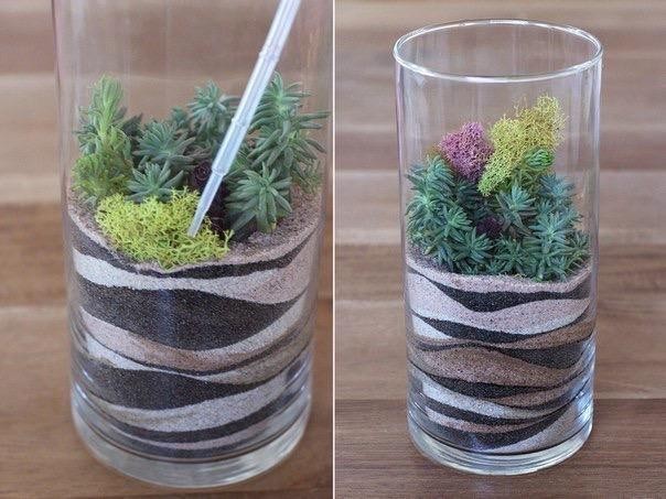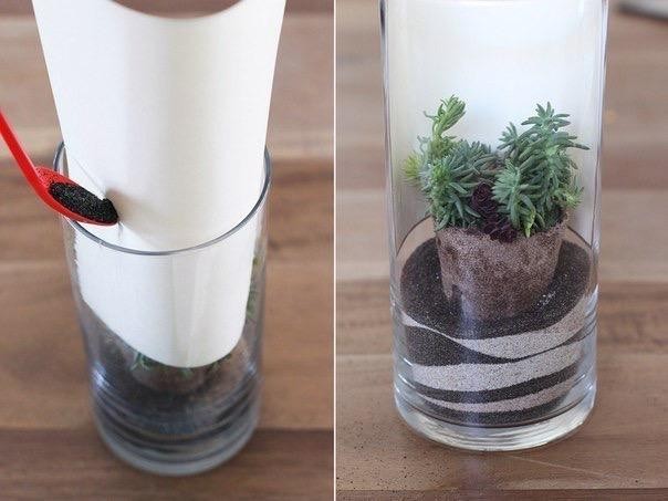 Террариум для растений с красивыми полосками песка создается шаг за шагом благодаря мастер-классу, расположенному ниже.