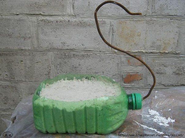 Для работы нам понадобится 5-литровая пластиковая бутылка квадратной формы, железный прут 0,6 мм, бинт, стартовая шпаклёвка, небольшой шпатель, кисточка и маленькая ёмкость с водой, ёмкость для замешивания раствора и песочек, либо другой наполнитель.