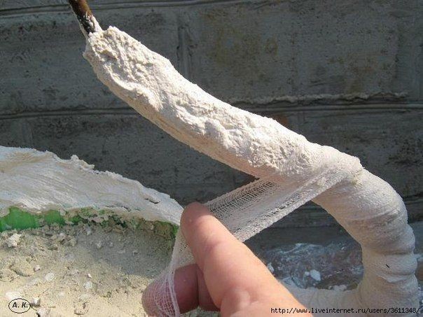 9. Когда крыльям нужно дать отдых, мы плавно переходим к изготовлению шеи… Опять же мокрыми руками формируем валик из раствора и прикрепляем к пруту.