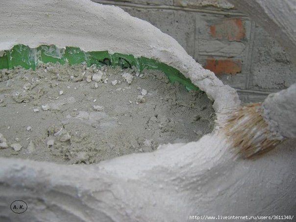 8. Ну, что отдохнули? Увлажняем наши ручки и берём в одну руку немножко раствора, прилепливаем к внешней стороне крыла, а второй рукой придерживаем всё это с внутренней стороны… Аналогично поступаем со вторым крылом. Не бойтесь, если не очень хорошо прилипает, перейдите на время к выполнению второго крыла и вот так попеременно все у Вас получится. Ну, а все изъяны мы исправим попозже, когда слегка будет подсыхать шпаклёвка.