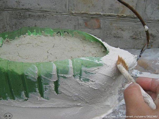 3. Рабочее место устилаем плёнкой, замешиваем круто раствор шпаклёвки и шпателем наносим на плёнку слой раствора для днища нашего кашпо.