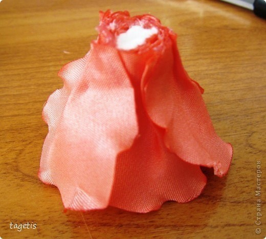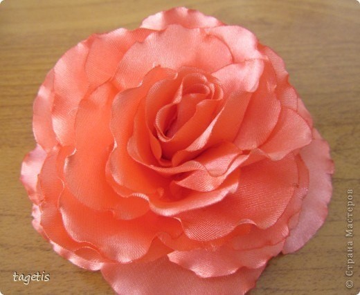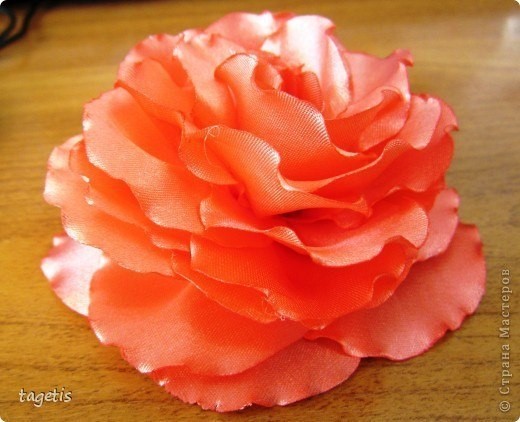 Распустившаяся роза из атласных лент дабавит праздничного настроения, где бы она ни появилась.