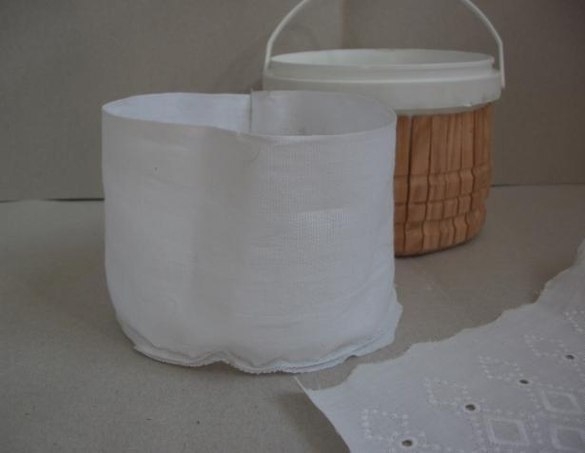 Корзинка-органайзер из деревянных прищепок и прошвыПрошву стоит делать съёмной, чтобы была возможность стирать.