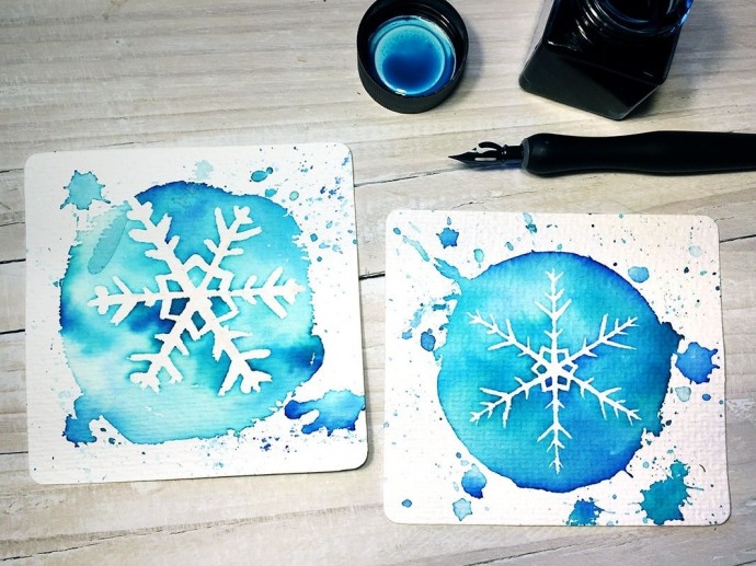 Если решите ставить дело на поток, то в хобби-маркетах лучше приобрести резервирующую жидкость для акварельной бумаги. Её кистью наносим на белое, сверху проходимся акварелью, а потом снимаем резерв, как пленочку с листа. Быстро, чисто, оригинально.