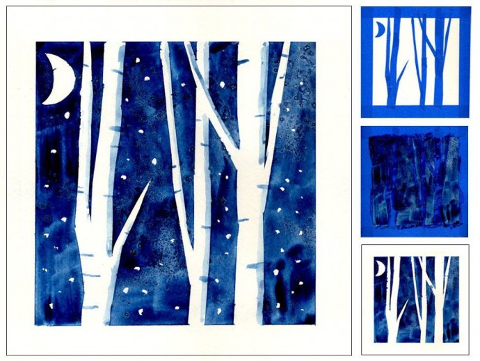 Удаляя сухой салфеткой с листа излишек воды и слой краски, можно нарисовать зимние ели, покрытые снегом, или пену морскую. Бледная луна или солнце получатся, если обернуть бумажной салфеткой тубус от туалетной бумаги и промокнуть акварельное небо. Даже уже высохший рисунок можно подправить, сбрызнув его водой и аккуратно потерев нужное место.