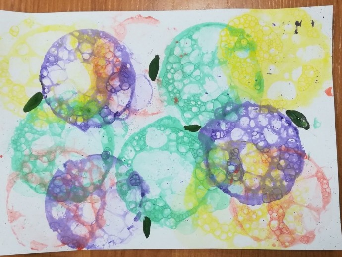 Веселье и красивая текстура в одном флаконе. В ёмкости нужно смешать воду, немного жидкого мыла и много-много краски. Вручаем ребёнку трубочку и разрешаем выдувать пузыри. Как только вырастает высокая шапка, прикладываем к ней бумагу. Ребенка при этом лучше вовсе раздеть, чтобы потом проще отмыть было.
