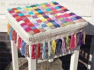Самое правильное использование остатков пряжи, которое понравится всем домочадцам, это сделать табуретку красивее и удобнее.