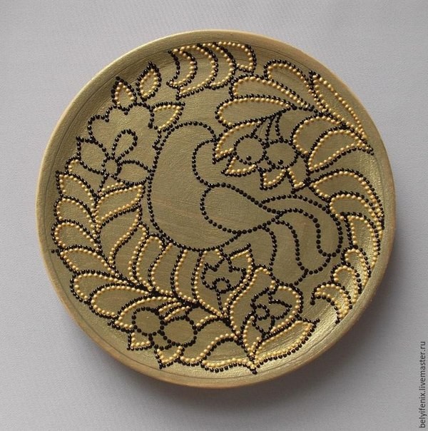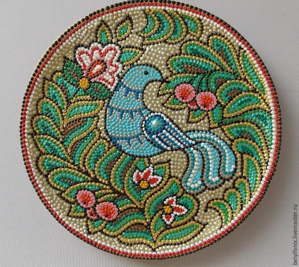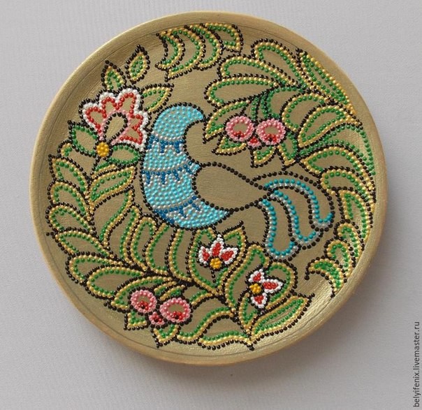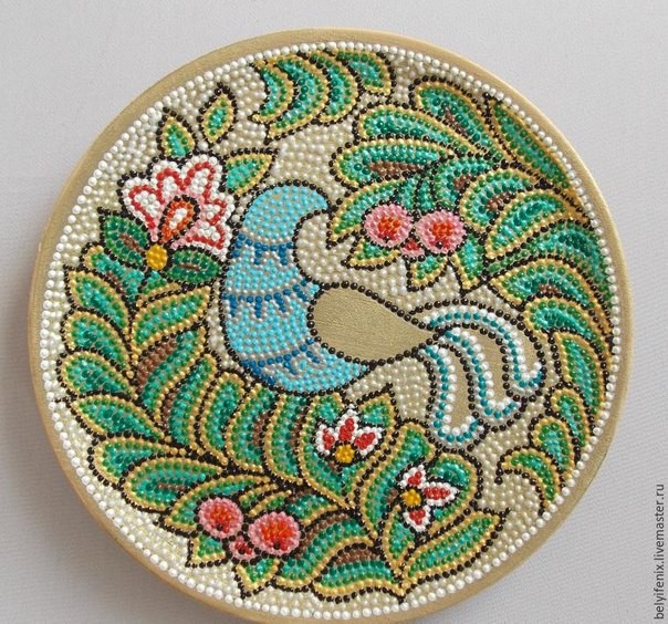Тарелка в технике точечной росписи "Птица удачи" хороша тем, что точечная роспись с легкостью создается проставлением точек согласно узора.