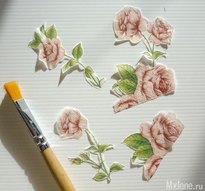 Настенные часики в стиле шебби шик: часть 2Губкой смачиваем поверхность распечатки. Скатываем ненужные слои бумаги.Покрываем всю заготовку акриловой краской, заходя на края распеча...