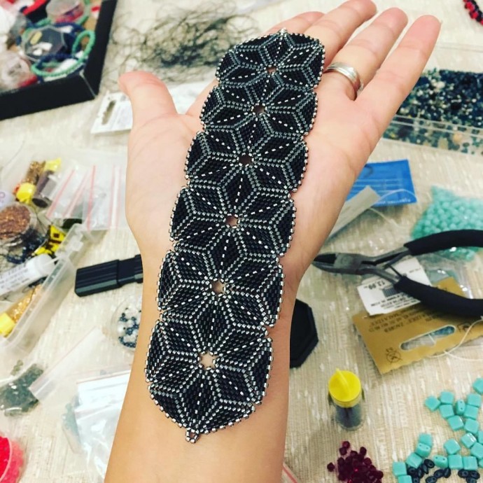 Широкий браслет с геометричным узором так хорош и эффектен, что хочется им блеснуть как можно скорее.