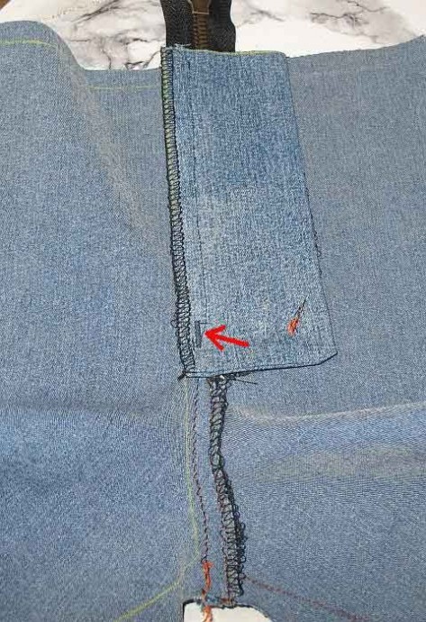 Далее - стандартная обработка откоска и притачивание гульфика к правой половине (притачивается на 1 мм. левее от намеченной линии)Я обработала срез на правой половине по среднему шву на оверлоке, но в джинсах, когда идет двойная отстрочка, этот срез обычно не обработан вообще, поскольку припуск левой половины его обычно перекрывает. Более того - в грубых тканях делаются небольшие надсечки, чтобы припуск беспрепятственно заутюживался по дуге.