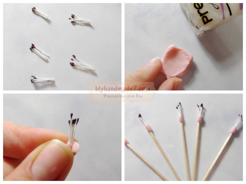Разомнем кусочек глины белого цвета с небольшим количеством ярко-розовой пастели. Разминаем очень интенсивно и тщательно, чтобы цвет материала вышел равномерным. Получив однородную розовую глину, отщипываем маленький кусочек и облепливаем им им нижний край пучка тычинок. После этого осторожно накалываем каждый такой пучок с глиной на острие зубочистки. Всю процедуру повторяем пять раз по количеству пучков. Сердцевинки для цветов готовы.