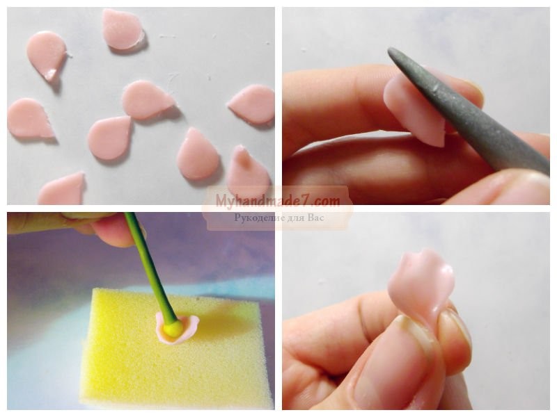 После этого делаем лепестки. Для этого раскатываем розовую глину равномерным слоем толщиной примерно в 2 мм, подобно тесту для пельменей. Из этого пласта специальной пластиковой формочкой вырезаем кружки-заготовки. Если подходящей формочки у вас нет-не страшно. Можно изготовить лепестки поштучно из небольших кусочков термопластика. Лепестки должны быть неравномерными по толщине. При разминании шарика один край делаем более тонким - это будет верхняя часть лепестка. Делать это можно стеком или руками. Нижняя часть более толстая. Кроме того, чтобы форма лепестка была более естественной, кладем заготовку поверх губки и поглаживаем круговыми движениями по центру, чтобы она приобрела вогнутую форму. Завершая изготовление лепестка, защипываем нижнюю часть заготовки. Лепесток готов. Всю процедуру нужно будет повторить 30 раз. Всего нам понадобятся 6 цветков.