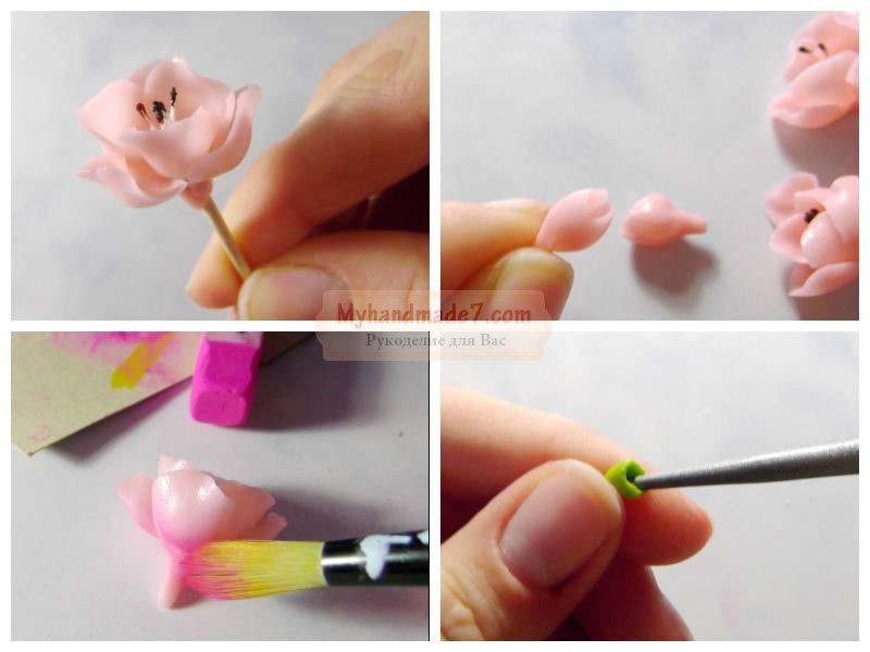 Цветочки готовы, теперь делаем чашелистики. Из небольшого кусочка зеленой глины формируем шарик и слегка вытягиваем и заостряем один конец, чтобы получилась капелька. Затем в утолщенную часть капельки вставляем стек или зубочистку и формируем стенки воронки. Готовые запеченные цветы и бутончики снимаем с зубочисток. Если необходимо, подчищаем нижний край ножом и вставляем в чашелистик-воронку.
