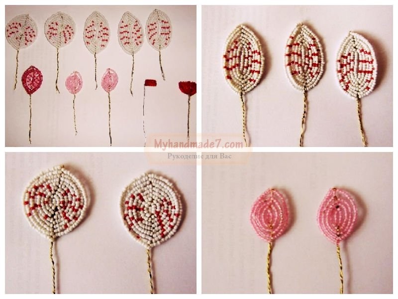 Удлиненные лепестки начинаются с ряда в 12 бисеринок, а округлые всего с трех. Розовые лепестки плетутся, начиная с 4 бисерин. Нижний лепесточек губы делают из красного и розового бисера, основа состоит из 6 бусин. Нижняя трубка плетется из красного бисера , начиная с 12 бусин, всего 4 ряда. Затем верх и низ лепестка стягивают вместе. Верхняя трубочка делается в технике параллельного плетения и состоит из семи рядов, по восемь бусинок в каждом.