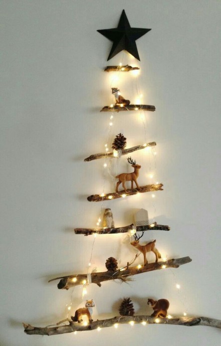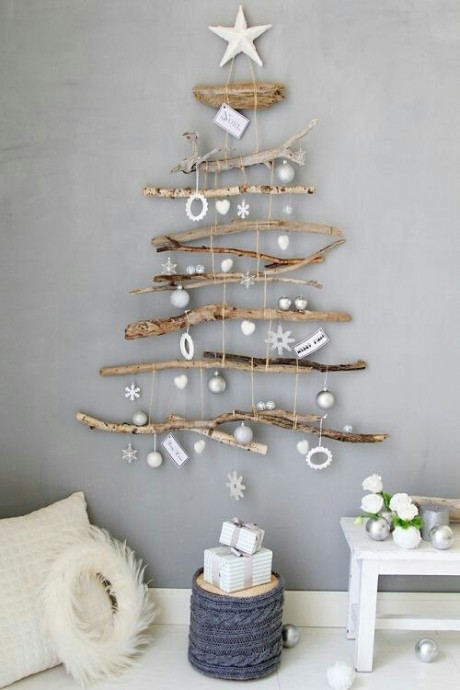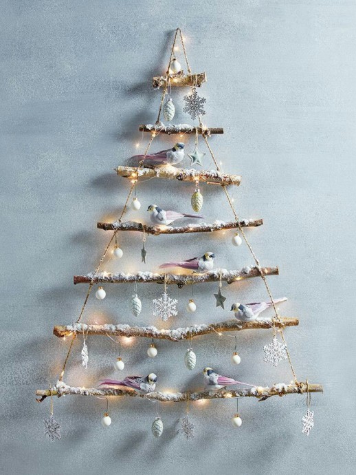 Плоская настенная ёлка из веток романтично притягательна. Ее необычный вид вдохновляет на своеобразную практику, когда вы позволите себе просто стать самими собой без условностей.