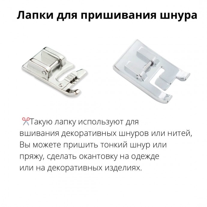 Такую лапку используют для вшивания декоративных шнуров или нитей, Вы можете пришить тонкий шнур или пряжу, сделать окантовку на одежде или на декоративных изделиях.