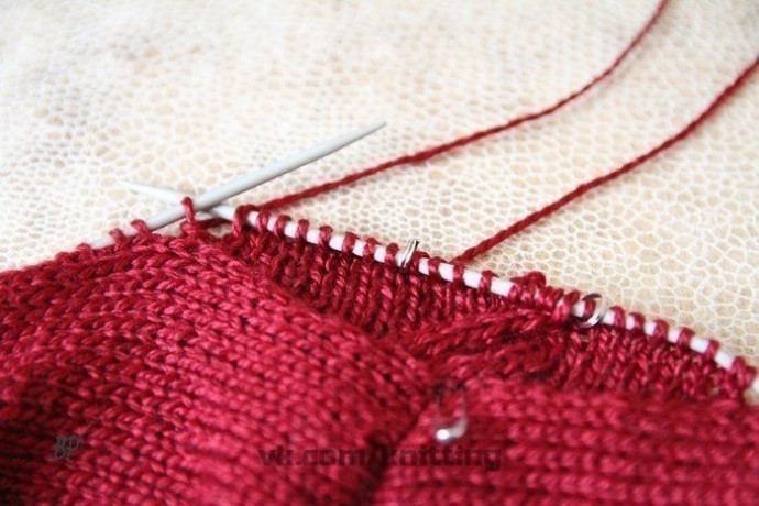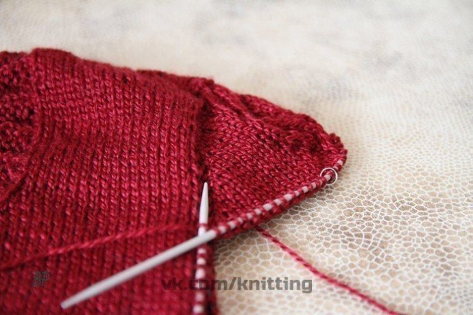 Отмечаем центральную петлю, ту что у плечевого шва. (У меня вы увидите еще 2 маркера, это потому что по центру рукава шел узор в 9 петель, маркеры для него, но по ним вы сможете легко ориентироваться, как прибавлялись мои ряды.)