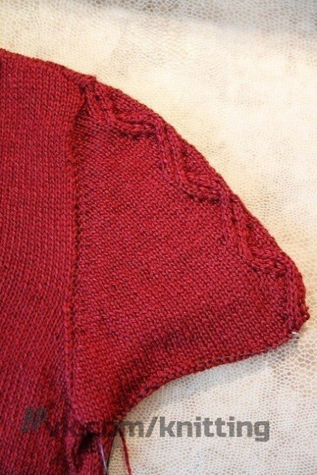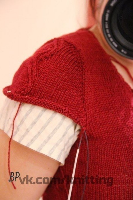 Набираем петли вокруг всей проймы, начинаем от «бокового шва», идем вверх по переду, до плеча, затем дальше по спинке, вниз, опять до «бокового шва». Отмечаем начало нашего ряда.