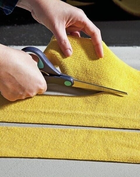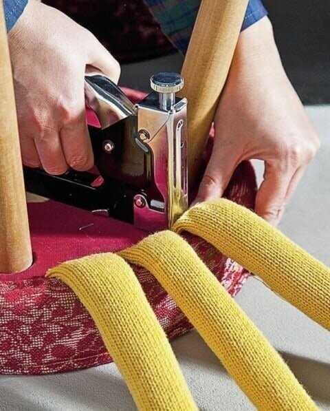 Идея обновления старой табуретки это еще и идея, куда пристроить остатки пряжи, если полосы сделать из оставшихся клубочков разных цветов.