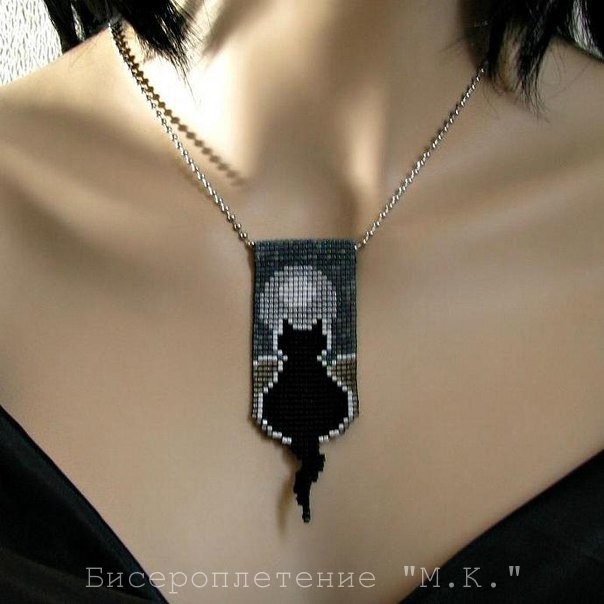 Кулон из бисера "Силуэт кошки на фоне луны" настолько оригинален и смел, что станет отличным дополнением к ультрамодному луку.