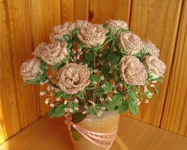 Букет роз из бисера: мастер-классЕсли вы скучаете по летнему саду, поставьте букет роз в напольную вазу.