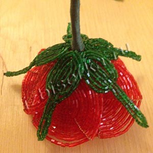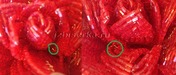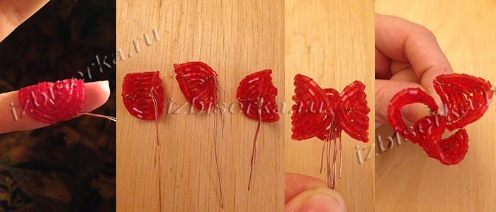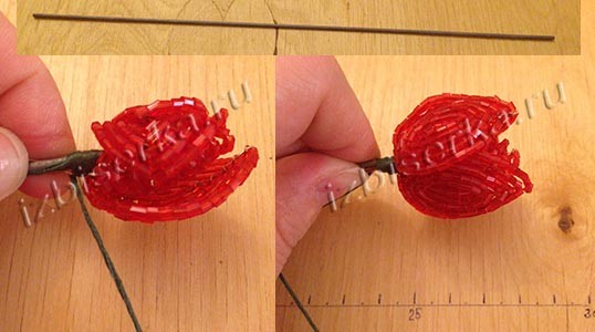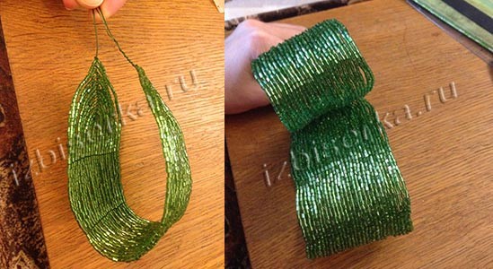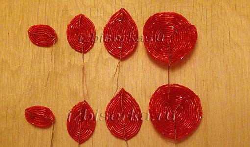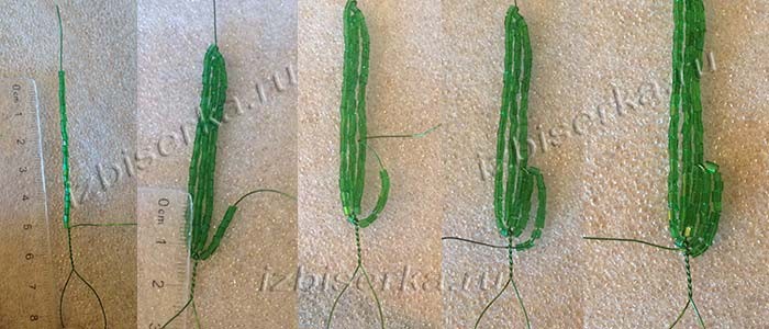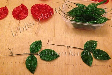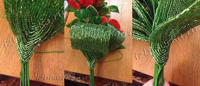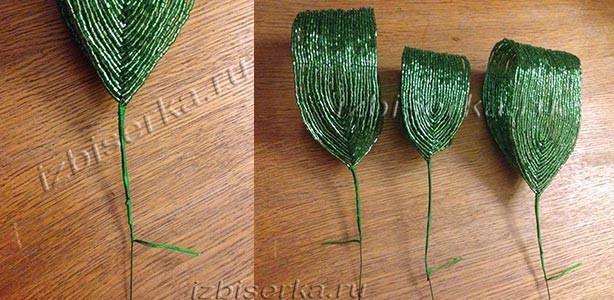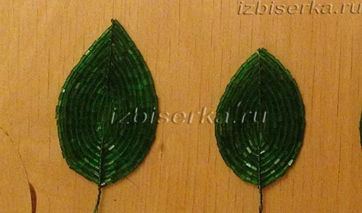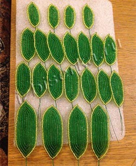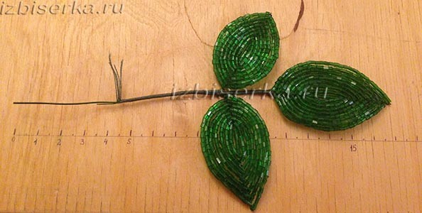 Ширина их 6-6,5 см. На ось набираем 20 см бисера и плетем 15 полных дуг. Верх и низ острые. Прошиваем листья в пяти местах. Также сгибаем их дугой. Концы проволок соединяем, удлиняем, если концы короткие и обматываем нитками.
