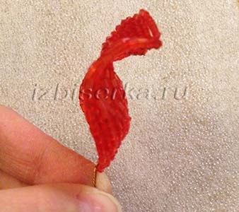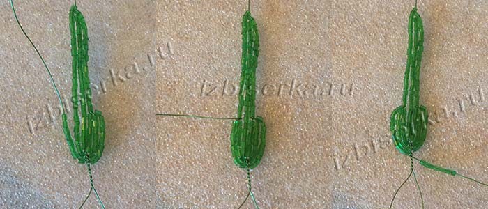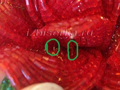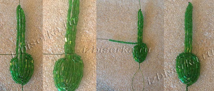 Снова набираем бисер столько, чтобы зацеп был на 1 бисерину выше предыдущего, и прошиваем как бы чашелистик, переходя на другую сторону. Делаем возвратную дугу. Чашелистик готов.