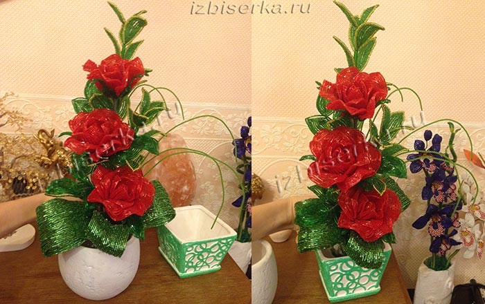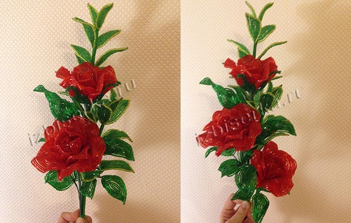 Если хотите сплести большие розы, то и остальные веточки тоже надо делать чуть больше, чтобы все было пропорционально.