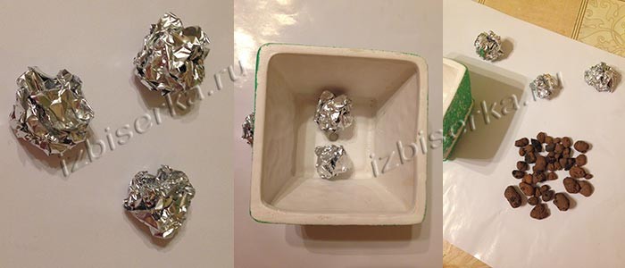 Надо из фольги скатать 5-6 штук небольших шариков, неплотных. Разводим гипс (алебастр) с водой погуще. Кидаем 3-4 шарика на дно и небольшими нашлёпками кладем смесь гипса. Желательно, чтобы они не соприкасались между собой (нашлёпки). С лицевой стороны горшка кладем гипса больше. Сажаем композицию. Немного подождем, пока схватится раствор. Разведем еще немного гипса и теперь аккуратно заливаем тыльную сторону. Я в процессе еще и керамзит туда бросаю и оставшиеся шарики.
