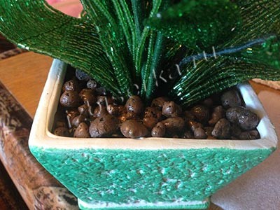 Всё крепление должно быть на одном уровне. Никаких ниток и проволок не должно быть видно из горшка. Вся некрасивость должна уйти в гипс в горшок.Закругляем концы проволок. Примеряем композицию к высоте горшка. Зеленый на мой взгляд, подходит лучше.