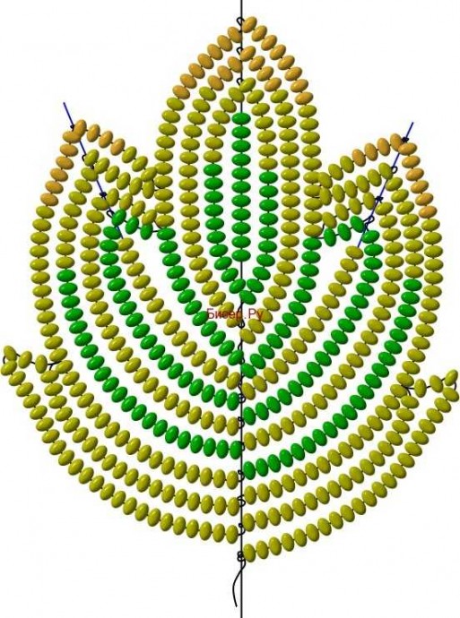 Отличие этих видов лепестков заключается в том, что верхушка заготовки будет немного заостренной. Кончик первой половины и начало следующей половины первой полосы будет составлять с центральным р. уголок в сорок пять градусов. Кончик основного материала следует закрутить на главной полосой так, чтоб последняя стекляшка первой части такого же р. расположилась между 1-ой и 2-ой бисериной следующей половины начального р.