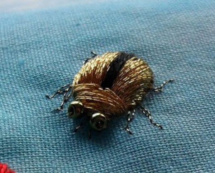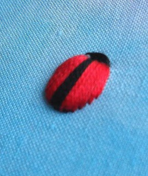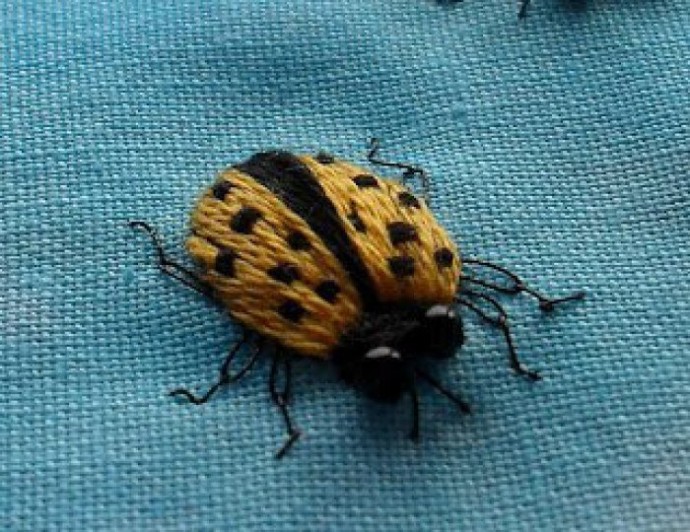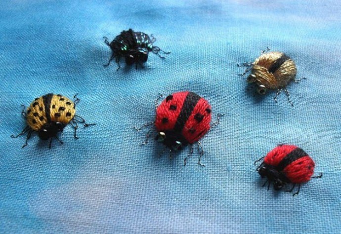Объемная вышивка жучков и Божьих коровок подойдет как для одежды, так и для салфеток и любых других деталей интерьера. И даже для украшения сумок.
