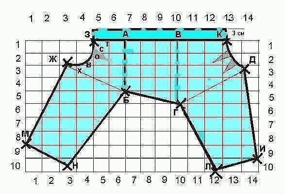 7. Далее выкраиваем две детали - (Ж-Б-Н-М) и две детали - (Г-Д-И-Л). Это будут внутренние стороны брючин. Сострачиваем каждую из половинок выкройки с внутренними сторонами брючин;