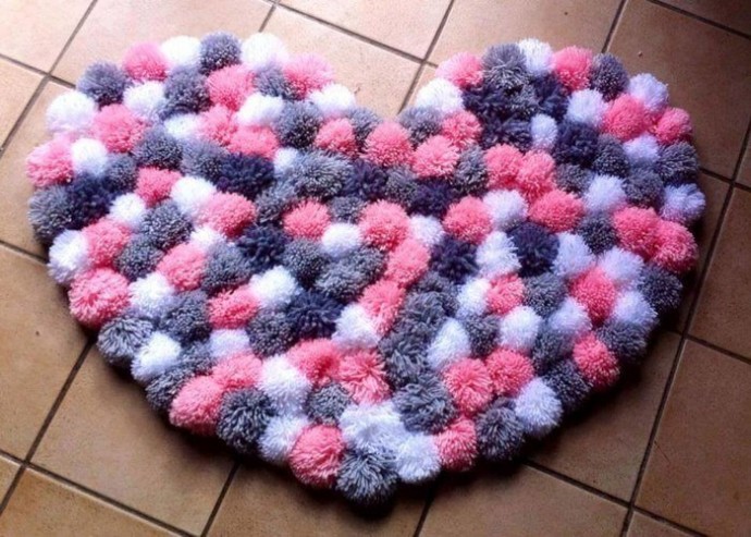 Коврик-сердце из помпонов это самый просто и самый уютный подарок ко дню всех влюбленных.