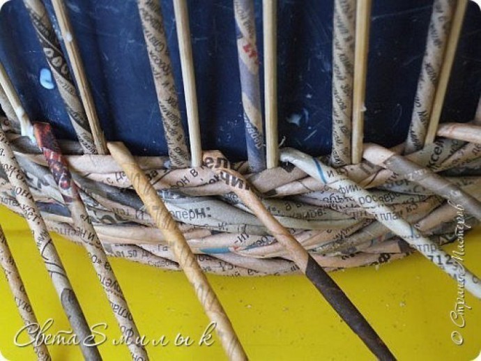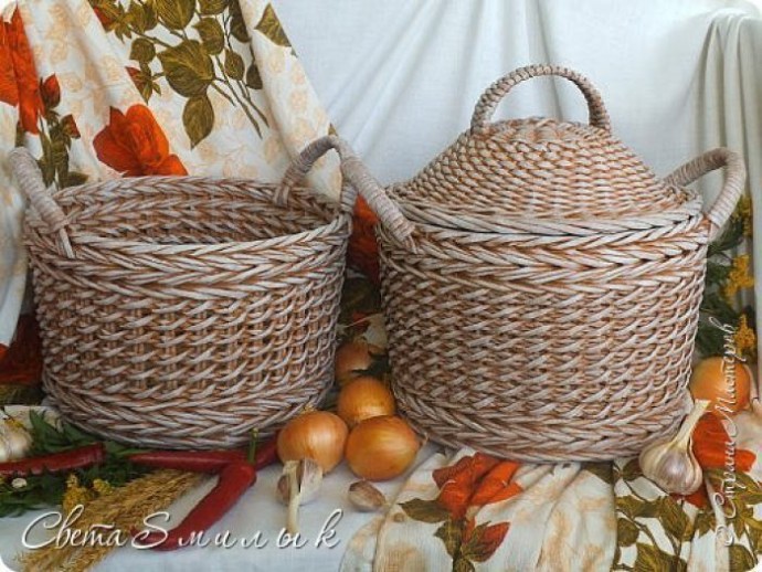 Корзины сплела новым для меня плетением. Когда-то я скопировала фото плетеной сумки-кошелки с какого-то буржуйского сайта, все время поглядывала на него, но МК плетения мне ни разу не попалось. И тут я внимательно присмотрелась и решила попробовать расшифровать узор самой, покрутила туда-сюда трубочки и у меня получилось.
