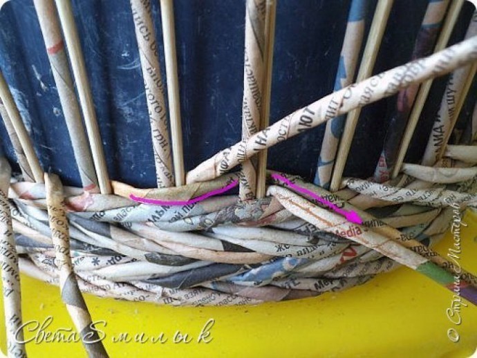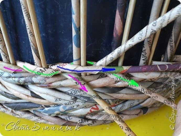 Далее берем верхнюю трубочку (син) заводим,как всегда перед соседним стоячком,под его рабочую трубочку и над предыдущей заведенной (салат) и заводим за второй стоячок и укладываем за его рабочей трубочкой. Эту процедуру выполняем по кругу в том же порядке.