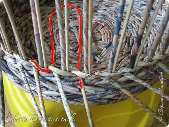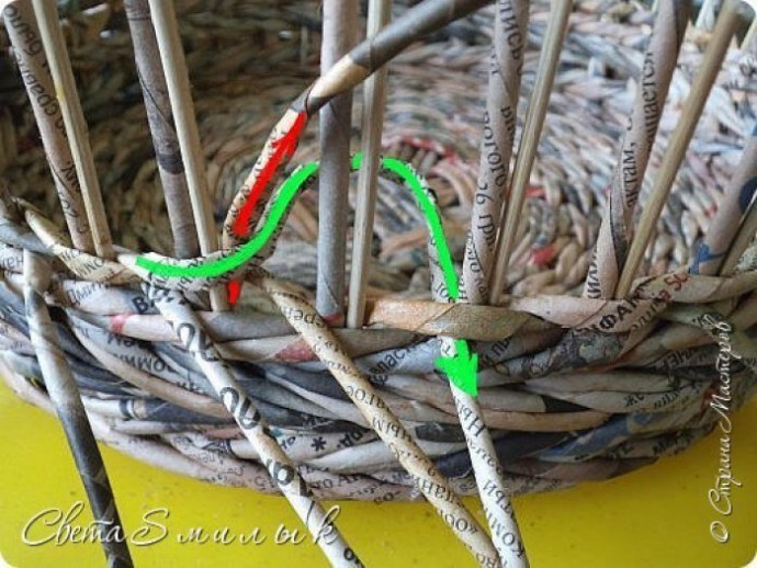 Плести начинаем с любого места. Рабочую трубочку заводим перед сосединим стоячком, под соседнюю рабочюю трубочку и заводим за второй стоячок и укладываем за его рабочую трубочку.