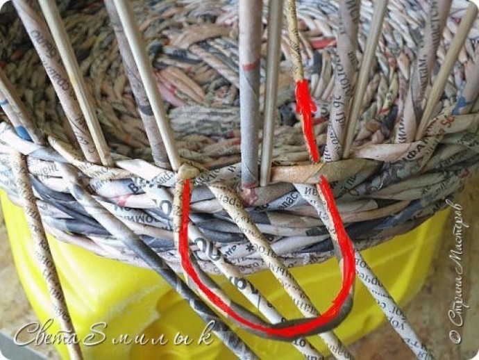 Плетем веревочку из 3-х трубочек и прячем обрезанные кончики между стоечкой и трубочкой, предварительно смазанные клеем.