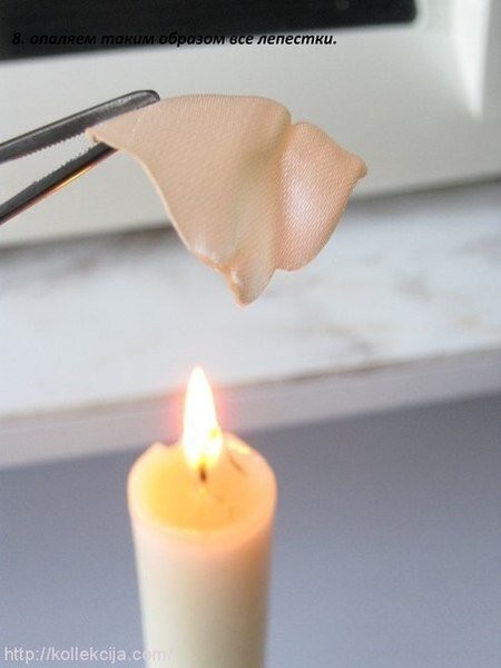 Роза из атласных лент: мастер-классДля опаливания кромки удобнее пользоваться не зажигалкой, а огнем свечи.