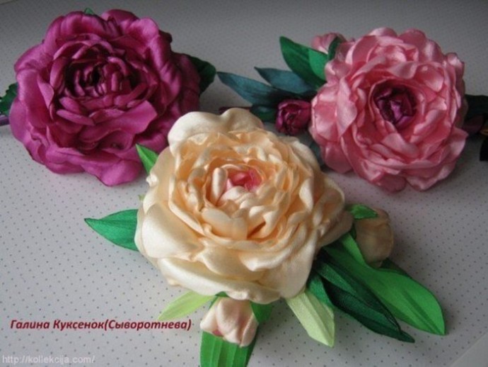 Нежные розы из атласных лентНежные розы из атласных лент выглядят как прекрасные живые розы.
