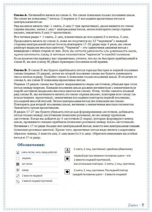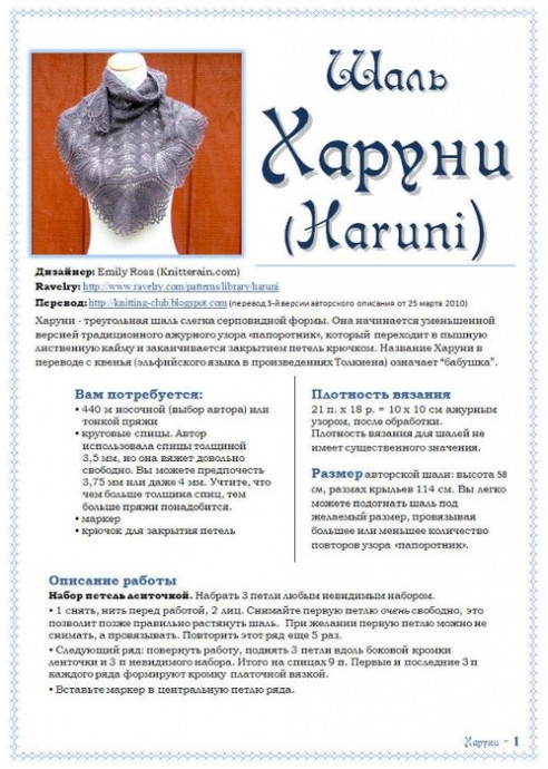 Дизайнер шали " Харуни": Emily RossОна начинается уменьшенной версией традиционного ажурного узора «папоротник», который переходит в пышную лиственную кайму и заканчивается закрытием петель крючком.