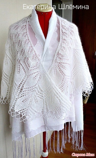 Блокировка. Спрятать концы нитей, намочить и растянуть шаль, придав ей треугольную или слегка серповидную форму.