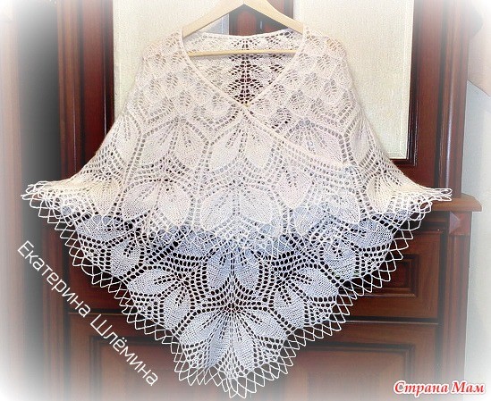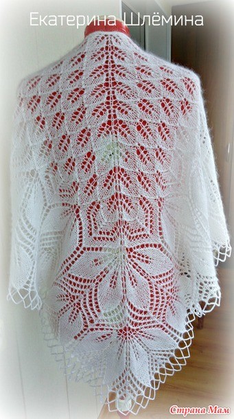 17 ряд - кромочная, 1лиц., 2вместе протяжкой, накид, 2вместе лиц. протяжкой , 11 лиц., 2 вместе лиц.,накид, 3 лиц., накид, 2 лиц. вместе протяжкой, 11 лиц., 2 снять,1 лиц. протяжка, *накид, 2 снять,1 лиц. протяжка, накид, 2 снять, 1 лиц. протяжка,11 лиц., 2 вместе лиц.,накид, 3 лиц., накид, 2 лиц. вместе протяжкой, 11 лиц., 2 снять,1 лиц. протяжка, *... перед центральной вместо 2 снять,1 лиц. протяжка я вязала 2 вместе, накид, лиц., накид , центр. петля, накид, 1 лиц., накид и далее повтор от * до * до конца ряда, лишь в самом конце вместо 2 снять,1 лиц. протяжка вяжем 2 вместе , накид,2 вместе , 2 лиц.