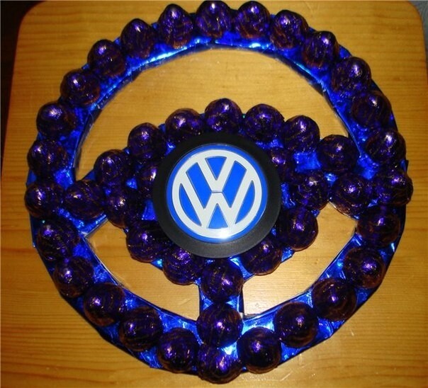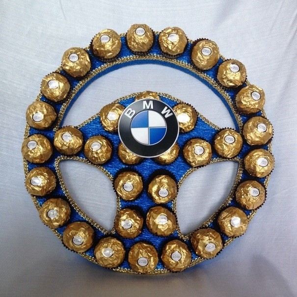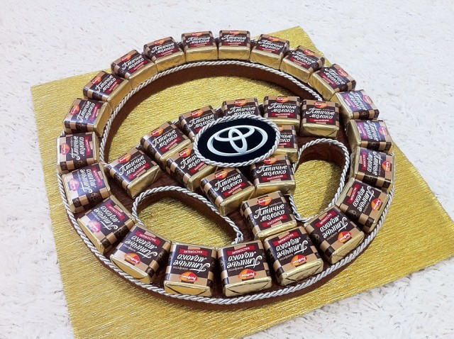 Подготавливаем конфеты, для чего подклеиваем все «хвостики» на саму конфету круглой формы, все подготовленные таким образом конфеты приклеиваем на руль.