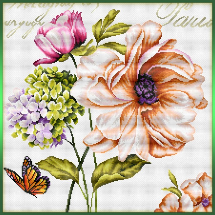 Чудесные цветы в спокойных тонах это отличная вышивка для спальни или той комнаты, куда вы хотите внести спокойную энергию гармонии и счастья бытия.