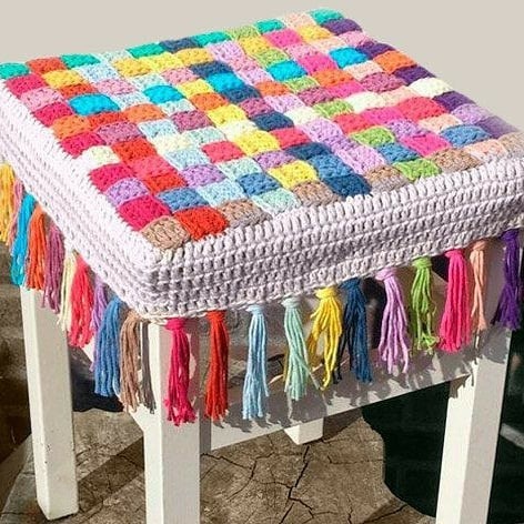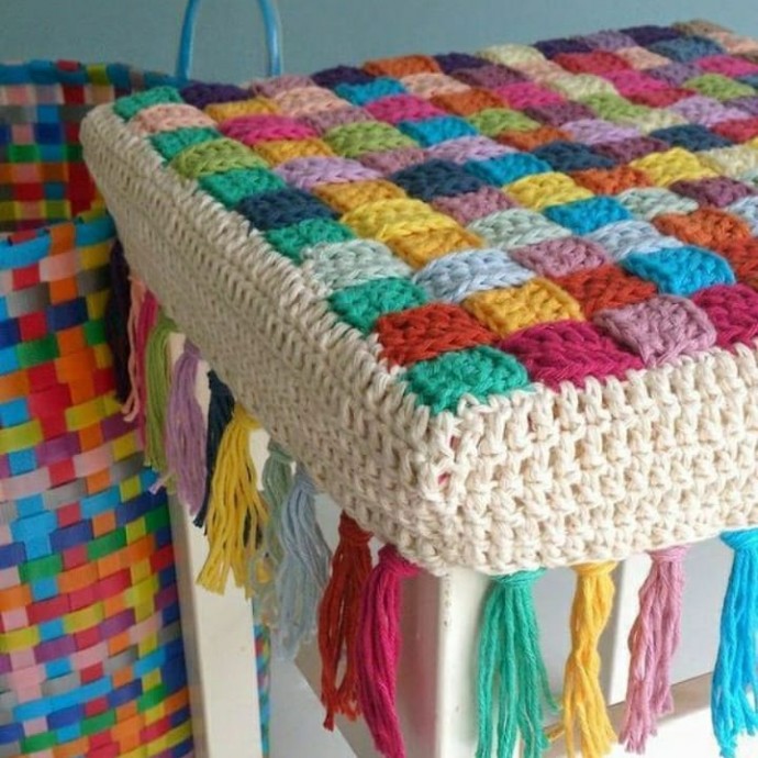 Красивое сидение на стул, связанное крючком, можно класть сверху чехла, наполненного холофайбером. Тогда сидеть будет мягче.